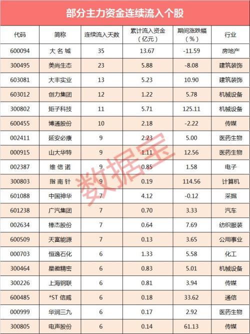 证券时报?数据宝统计显示,截至11月28日收盘,共有39只个股主力资金连续5个交易日以上持续净流入,连续流入天数最多的是大名城,该股已连续35个交易日净流入;连续净流入天数较多的还有美尚生态、大丰实业等,主力资金分别连续流入23天、13天。