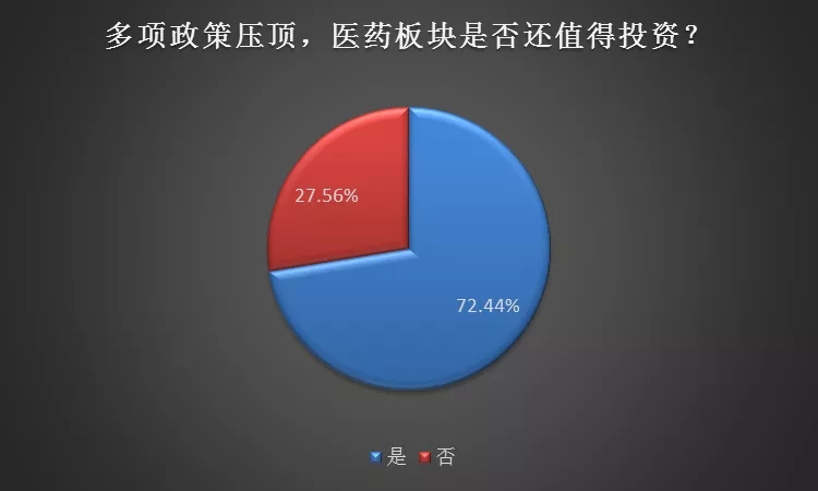 随着多项政策的全面铺开,2020年的医药板块是否还值得入场上车?对此私募排排网展开了调查,根据调查结果显示,有72.44%的私募认为纵然诸多政策呈现利空,但医药板块的机会尚存,医改之下行业会迎来分化,很多细分领域会迎来价值重估,龙头优质企业股价依旧可以屡创新高;另外27.56%的私募则认为带量采购是很多医药企业而言是灾难性的利空,且在去年不少医药企业的业绩涨幅远低于股价涨幅,高估值下回调风险较大,今年医药板块选股难度将会非常大,投资者还是应该谨慎为之。