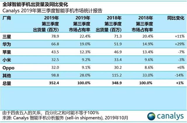 2019年第三季度的全球手机市场,三星依然保持着领头羊的位置,同比增长11%,而华为实现了6680万台季度出货量,同比增长29%。