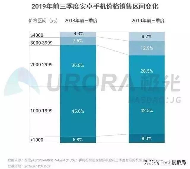 据极光大数据发布的《2019年Q3智能手机行业季度数据研究报告》显示,2019年前三季度,2000元以内的机型占到近整体50%左右,这意味着中低端手机的需求量最大,多数消费者换机的首选仍是2K以内机型,同时与2018年的占比变化不大,这也说明中低端手机市场需求持稳定势态。