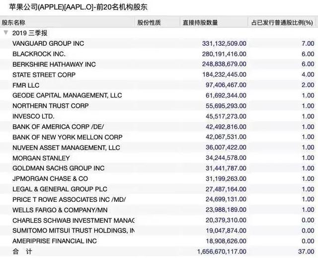 Wind数据显示,截至2019年三季度末,先锋领航作为苹果公司的最大机构股东,持股比例7%;