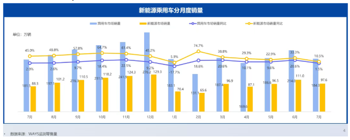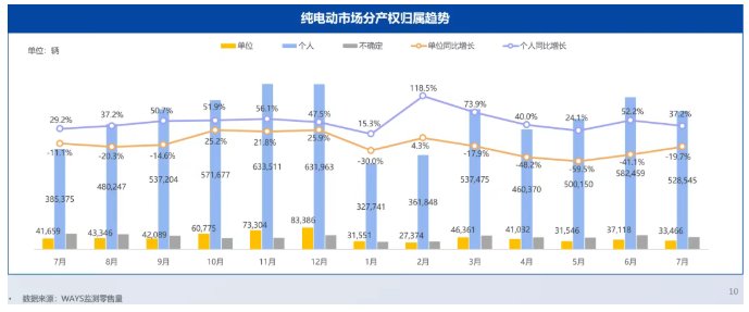 7月,纯电动市场个人用户占比为86.6%,同比增长37.2%;单位用户占比5.5%,同比下降19.7%。