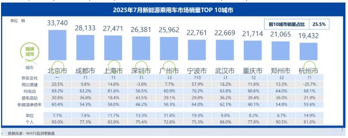 7月,TOP 10城市销量占比为25.5%,比上月(25.9%)减少0.4%;TOP 3城市分别是:北京市、成都市、上海市;宁波市和杭州市取代天津市、西安市进入前十。