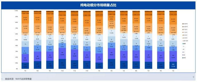 7月,纯电动市场销量TOP 3细分市场分别是:A0级(18.4%)、B-SUV(15.0%)和A-SUV(15.0%)。跟上月相比,因YU7交付增长较快,C-SUV市场份额上升相对明显(+1.1%);A-SUV级市场份额下降相对多(-1.3%)。