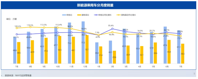7月,纯电动销量约61.1万辆,同比上涨25.0%,环比下降9.6%;插电混动销量约36.5万辆,同比下降7.5%,环比下降15.8%。
