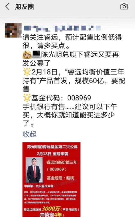 这样的火爆市场行情下,投资者热情也十分高亢,相关销售人员均预测本次募集将在当日提前结束且配售比例极低。在部分销售人员的朋友圈中,均提示投资者多备资金从而提高最终申购成功的额度。