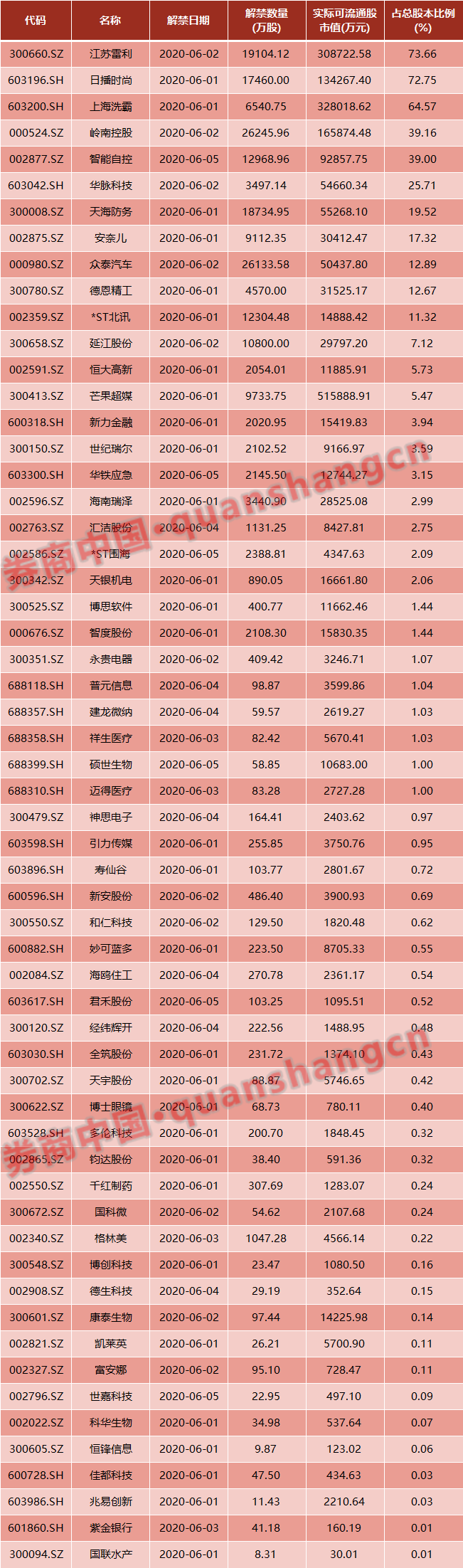 数据显示,本周(6月1日-6月5日)共有58家公司限售股陆续解禁,合计解禁量20.11亿股,按5月29日收盘价计算,解禁市值为204.85亿元。
