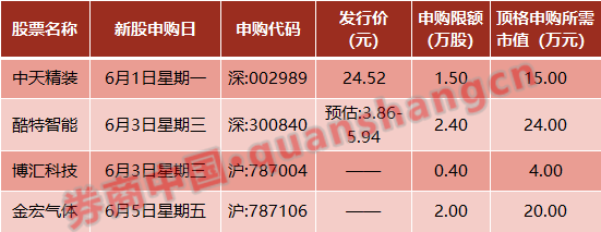 本周共有4只新股申购,分别是中天精装、酷特智能、博汇科技、金宏气体。