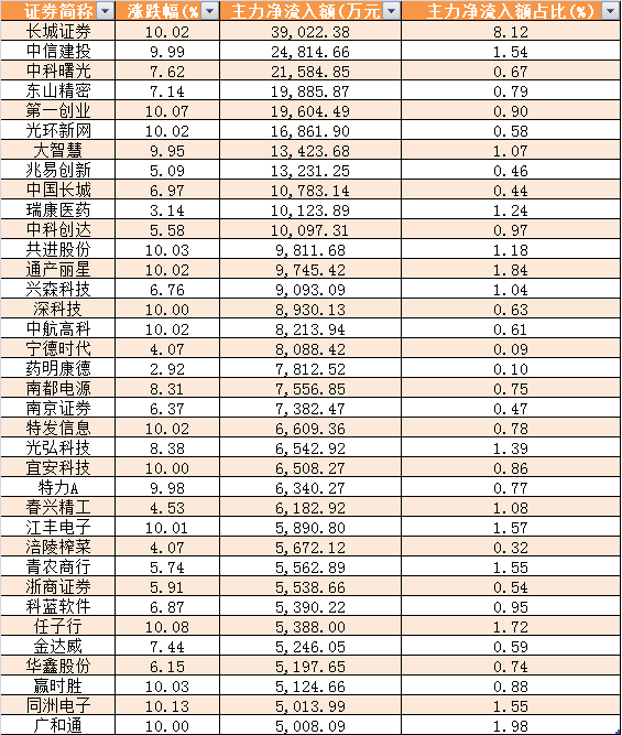 从个股资金流向看,共有487只个股主力资金净流入,长城证券主力净流入3.9亿元居首,中信建投、中科曙光、东山精密、第一创业、光环新网、大智慧、兆易创新、中国长城、瑞康医药、中科创达主力净流入金额在1亿元以上。共有36只个股主力资金净流入金额在5000万元以上。
