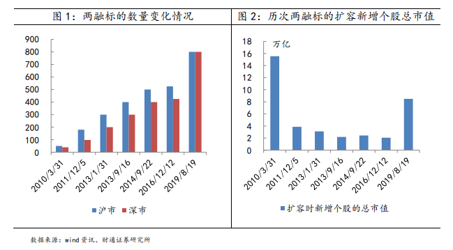 财通证券数据显示,从2010年开始,两融业务进入快速发展期,算上本次一共经历了6次大幅扩容,两融标的数量也从最初 90 只个股扩充到 1600 只个股(还不包括 27 只科创板个股)以及 64 只 ETF 基金。本次新增个股的总市值高达 8.5 万亿,为历次扩容之最。本次扩容后,两融标的个股在 A 股的总市值占比将提升到 80%以上。当然扩容规模和融资余额的增长并不直接相关,更多的与当时流动性环境以及市场的风险偏好有关。如 2016 年那次扩容后 6 个月,两市的融资余额还下降了约 1000 亿元。