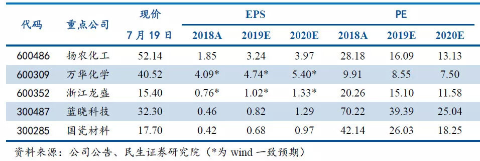 民生证券认为,安全事件发生后,环保整治及安全监管的力度和持续性不会低于上一轮,农药原药和中间体等停产企业复工恐将有所延迟,停限产增多,农产品价格企稳反弹有望带动下游需求回暖,产品景气提升;染料行业供给端遭受直接冲击,龙头市占率有望扩大,未来整个染料产业链供给都将持续紧缩,推动染料及中间体价格中枢上行。