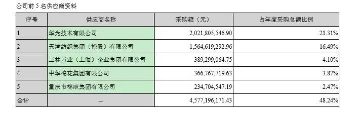 2018年年报显示,2018年度,华为技术有限公司是常山北明第一大供应商。报告期内,常山北明对华为的采购金额为20.22亿元,占常山北明年度采购总额的比例为21.31%。