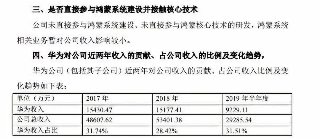 10月20日晚间,诚迈科技回复深交所关注函称,2019年上半年,来自华为收入为9229.11万元,公司总收入为29285.54万元,华为收入占比为31.51%。公司未直接参与鸿蒙系统建设、未直接参与鸿蒙核心技术的研发,鸿蒙系统相关业务暂对公司收入影响较小。