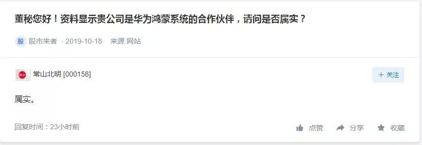 这还得从昨日常山北明发布的“两个字”说起。10月18日,有投资者在深交所互动易平台上问起:“资料显示贵公司是华为鸿蒙系统的合作伙伴,请问是否属实?”