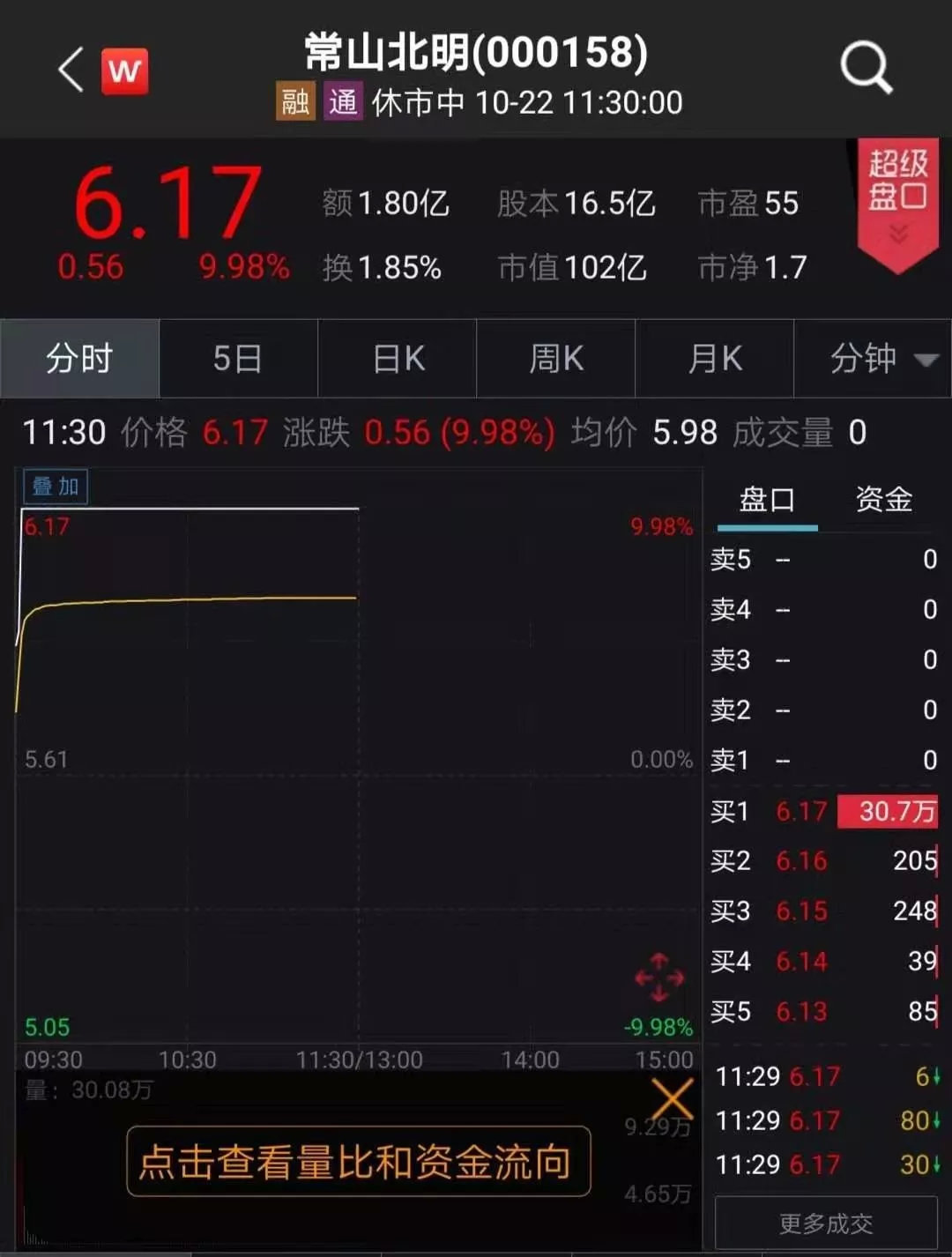 10月22日早盘,华为概念股常山北明涨停。截至发稿时,报6.17元,涨幅9.98%,成交额1.80亿元,买一上有30.7万手封单。