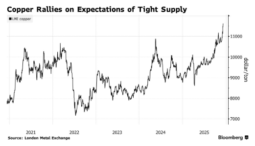 在全球供应趋紧背景下,受中国刺激政策及美国库存囤积提振,投资者持续看好铜价涨势,并推动了铜价攀升至历史新高。