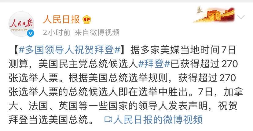 据多家美媒当地时间7日测算,美国民主党总统候选人拜登已获得超过270张选举人票。根据美国总统选举规则,获得超过270张选举人票的总统候选人即在选举中胜出。7日,加拿大、法国、英国等一些国家的领导人发表声明,祝贺拜登当选美国总统。