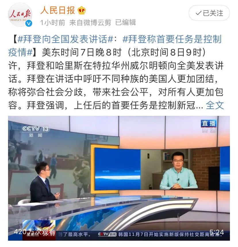 拜登强调,上任后首要任务是控制新冠疫情,将在下周一宣布一个由12名医学专家组成的新冠疫情应对团队。媒体此前报道,美国连续4天新增确诊病例超10万例。