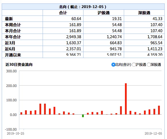 Wind数据显示,截至12月5日收盘,北向资金合计净流入60.64亿元。其中,沪股通净流入19.31亿元,深股通净流入41.33亿元,仍然维持“沪弱深强”的局势。
