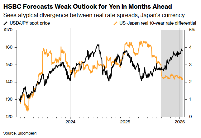 以aul Mackel和Joey Chew为首的汇丰外汇策略师表示:“两者之间的这种‘楔形差异’反映了日元‘风险溢价’的扩大。”策略师表示,自去年高市早苗当选日本首相以来,推动日元出现“结构性疲软”的投资者担忧包括:债务货币化、购买力下降,以及持续存在的通胀与负的实际利率。