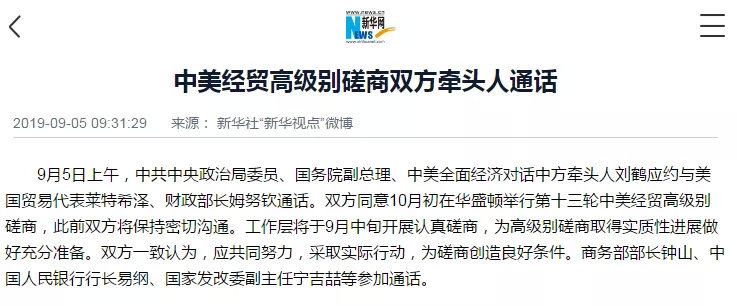 中美经贸高级别磋商双方牵头人通话