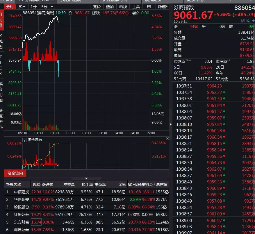 其次是红塔证券、海通证券和东方财富等券商也出现了暴涨。