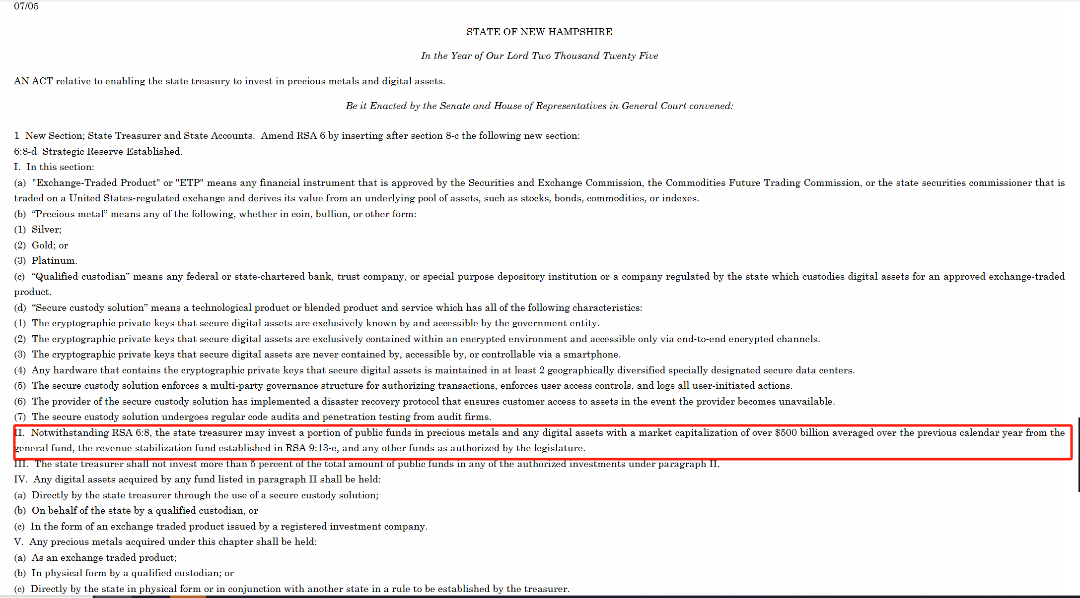 这条推文指的是HB 302法案,该法案允许该州政府将多达5%的公共资金投资于市值超过5000亿美元的贵金属和数字资产——在加密货币领域中,只有比特币符合这一条件。
