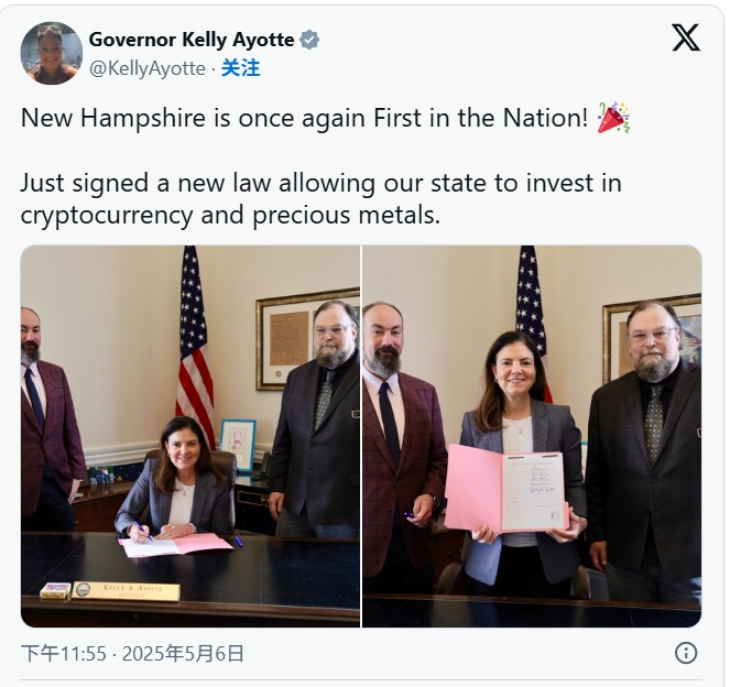 “新罕布什尔州再次成为全国第一!”新罕布什尔州州长凯利·阿约特(Kelly Ayotte)在X上写道,“刚刚签署了一项新法律,允许我们州投资加密货币和贵金属。”
