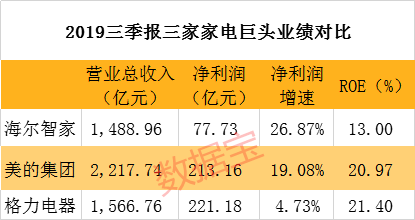 从业绩表现来看, 2019年三季报营收,排在第一位的还是美的,而无论是净利润还是ROE,格力美的都不相上下,海尔的净利润仅为二者的1/3。但如果看净利润增速,海尔则大幅超过美的和格力。