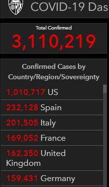 美国约翰斯·霍普金斯大学28日发布的新冠疫情最新统计数据显示,美国累计新冠确诊病例超过100万例。截止北京时间29日6时30分查询到的数据,美国新冠确诊病例升至1010717例,死亡病例58365例,确诊病例约占全球的三分之一。在过去24小时,美国新增确诊25343例,新增死亡2459例。全球确认人数311万,死亡21.68万。