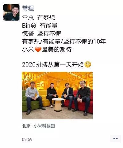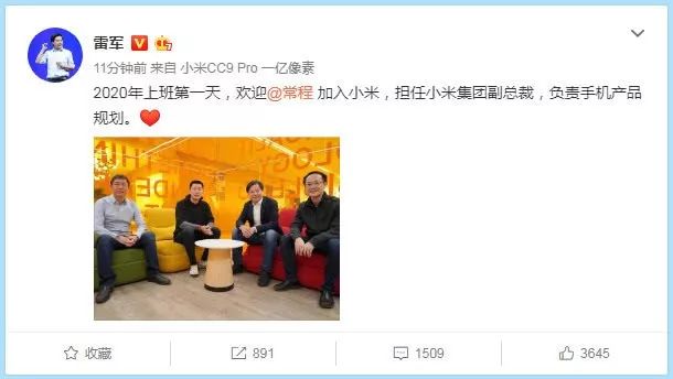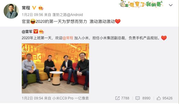 “2020年上班第一天,欢迎 @常程 加入小米,担任小米集团副总裁,负责手机产品规划。”