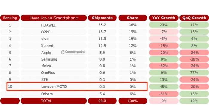 现在,常程真的去小米了。而在常程离职前,联想手机的境遇已经相当惨淡。第三方市场调研机构Counterpoint的数据显示,2019年二季度末,联想手机(含摩托罗拉)在中国市场销量仅为30万台。