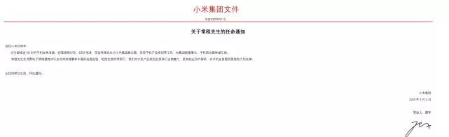 随后,小米发布了《关于常程先生的任命通知》,通知中称:“为全面推进5G时代手机业务发展,经管理层讨论、CEO批准,任命常程先生为小米集团副总裁,负责手机产品规划等工作,向集团副董事长、手机部总裁林斌汇报。”