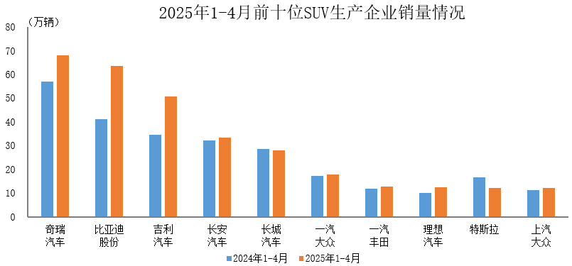 据中国汽车工业协会统计分析,2025年1-4月,销量排名前十位的SUV生产企业共销售311万辆,占SUV销售总量的69%。