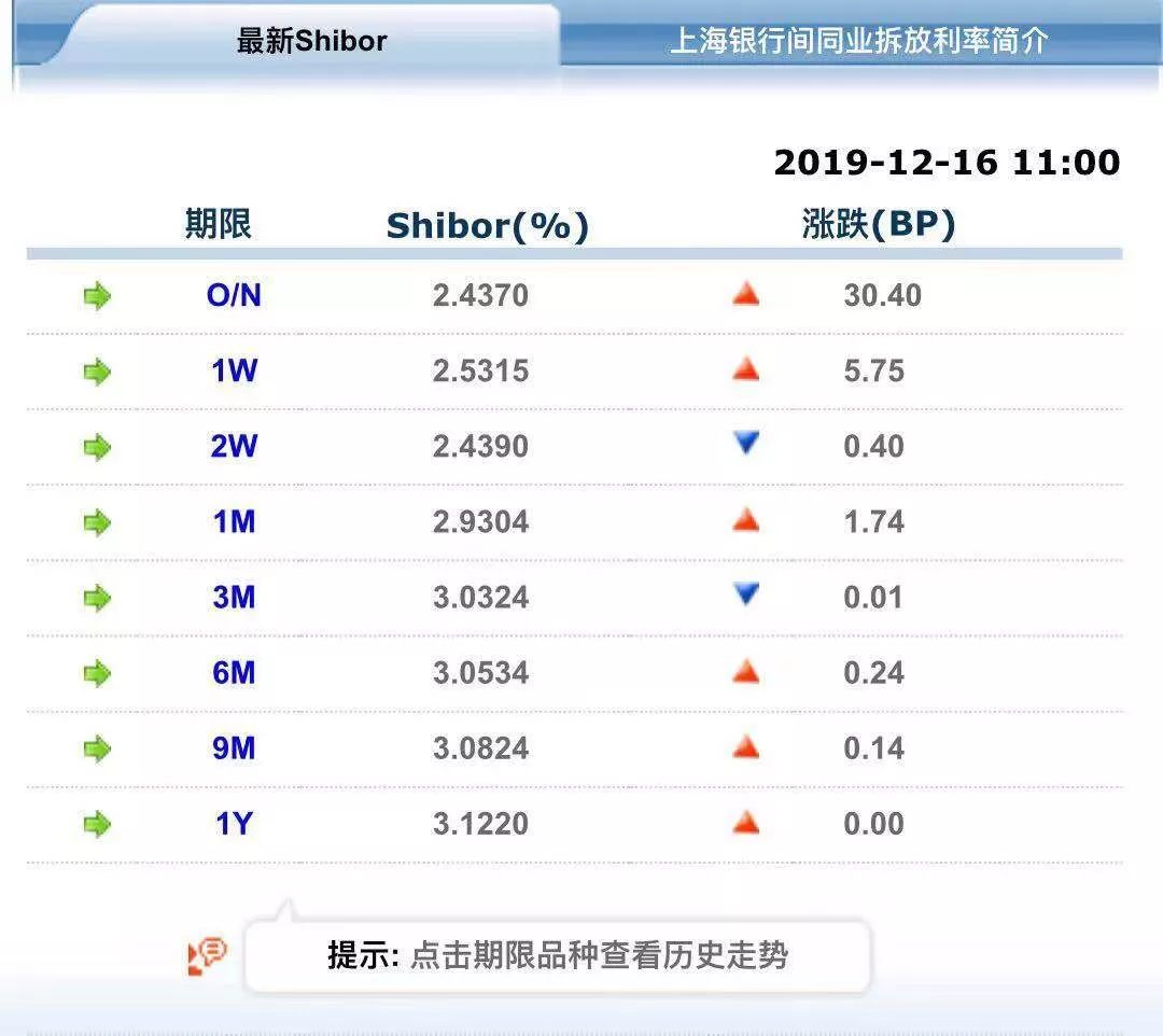 可以看出,短期资金利率稍有上涨,但总体仍在区间内部低位徘徊;相比之下,有了3000亿MLF的“补给”后,跨年资金利率今日反而有所回落,DR014和DR021均有一定程度回落。Shibor主要期限的资金价格走势也与银行间市场存款类机构质押式回购利率较为一致。