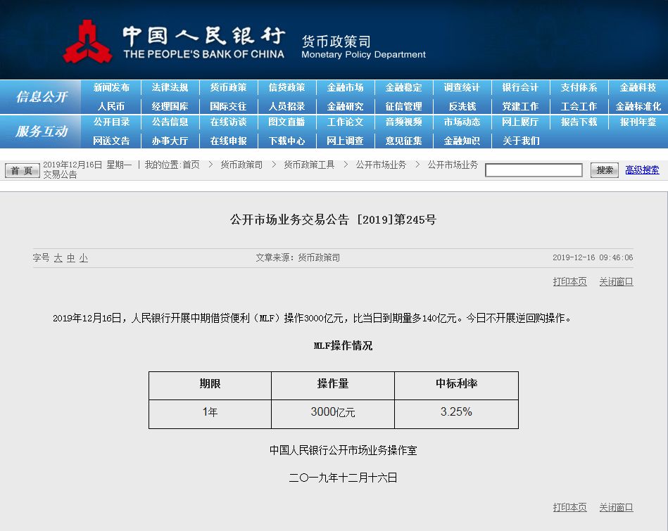 12月16日,央行发布公告称,当天开展1年期中期借贷便利(MLF)操作3000亿元,利率维持3.25%不变,比当日到期量多140亿元。今日不开展逆回购操作。