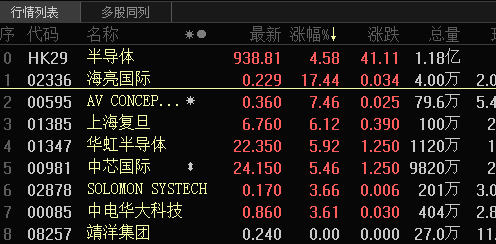 今日开盘后,港股半导体板块一路走高,涨幅一度扩大至超5%。截至午间收盘,海亮国际涨17.44%,中芯国际涨5.46%,华虹半导体涨5.92%,上海复旦涨6.12%。