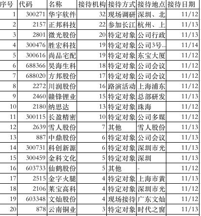 截止11月14日共有31份上市公司接待机构调研公告。华宇软件(300271)、正邦科技(002157)、金字火腿(002515)受到机构关注较多。