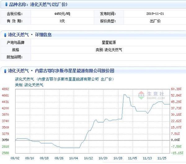 截止11月21日,内蒙古鄂尔多斯市星星能源有限公司LNG价格为4450元/吨,内蒙古鄂托克前旗时泰天然气有限公司LNG价格为4250元/吨。新疆庆华能源集团有限公司LNG价格为4300元/吨,陕西绿源天然气有限公司子洲LNG工厂LNG价格为4450元/吨,新疆广汇淖毛湖(兰州以东)LNG价格为3500元/吨左右,山西沁水新奥LNG价格为4150元/吨,达州汇鑫能源LNG价格为3950元/吨,陕西众源绿能天然气有限责任公司LNG价格为4500元/吨,各地液价涨跌互现。