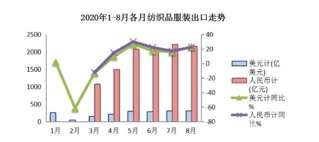 9月开始,市场上染费与部分热销面料出现了涨价的情况,从某种程度上说明了纺织市场行情的好转。从中国海关署公布的数据也可以看出,8月,纺织服装出口309.3亿美元,增长23.2%(全国货物贸易出口增长9.5%),其中纺织品出口147.2亿美元,增长48.5%,服装出口162.1亿美元,增长6.6%。