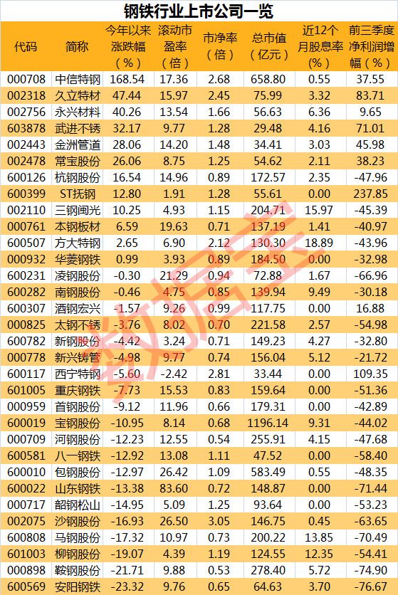 具体到个股上看,安阳钢铁、鞍钢股份、柳钢股份、马钢股份、沙钢股份年内跌幅都在15%以上。中信特钢今年以来涨幅超160%,是因为中信集团将特钢资产装入A股上市平台大冶特钢,实现整体上市。中信特钢在资产规模、收入规模等各方面都处于行业领先地位,今天股价再次刷新历史新高。