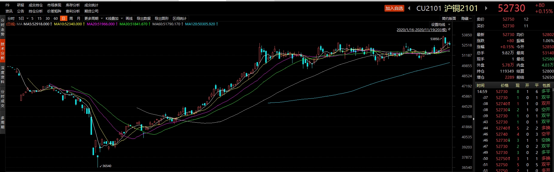 进入下半年之后,电解铜价格直接突破五万。而就在今年的3月23日,电解铜价格还位于2016年以来的新低。截至11月19日,沪铜2101主力合约价格又上涨至52730元/吨的高位。