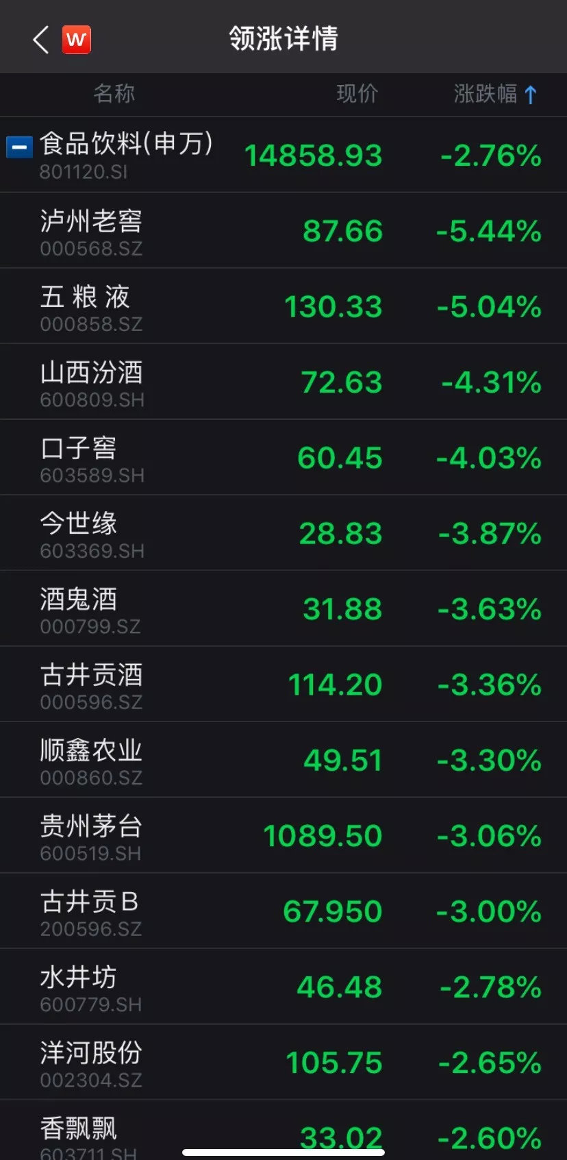 食品饮料板块午盘跌2.76%,成为申万一级行业板块中跌幅最大的板块。板块内白酒股跌势明显,泸州老窖、五粮液均跌逾5%,山西汾酒、口子窖跌逾4%,贵州茅台则跌逾3%,股价跌至1100元下方。