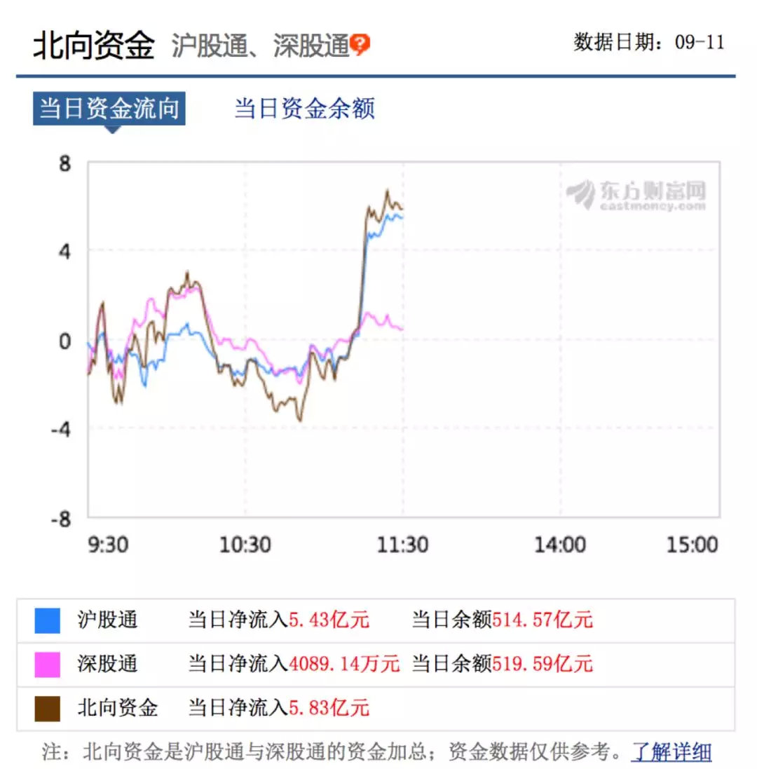 重磅频频落地,部分资金却逢利好兑现出逃,9月11日,沪深两市高开后震荡下行,上证指数盘中一度跌逾15点。不过,临近午盘时,大盘上翘行情上演,一度转涨,沪综指最终微跌0.1点,这背后是北向资金加速流入。