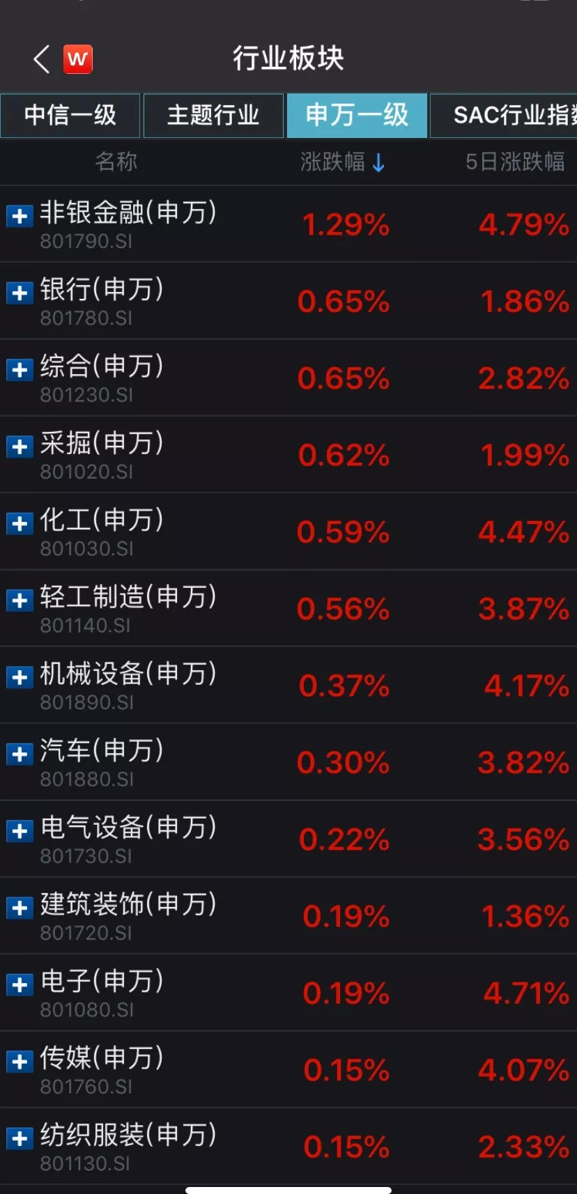 9月11日上午,非银金融板块高开后随大市回落转跌,临近午盘时强势拉升。截至午间收盘,非银金融板块涨1.29%,领涨申万一级行业板块;银行、综合、采掘、化工、轻工制造均涨逾0.50%。