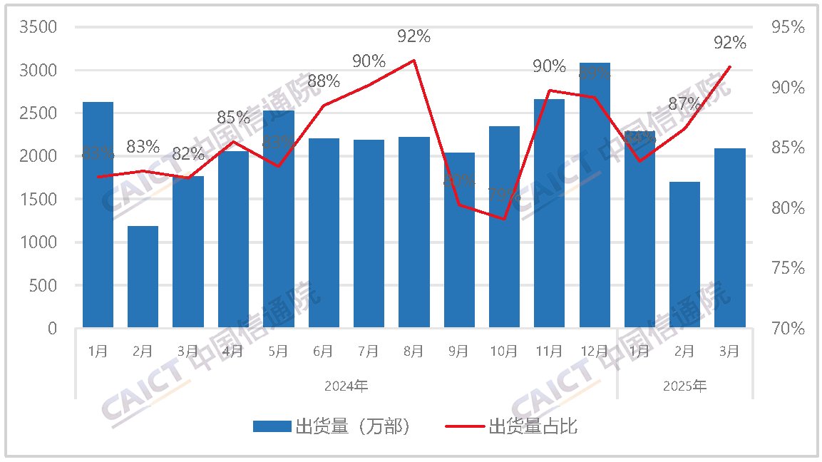 2025年3月,国产品牌手机出货量2087.8万部,同比增长18.4%,占同期手机出货量的91.7%;国产品牌上市新机型63款,同比增长40.0%,占同期手机上市新机型数量的98.4%。