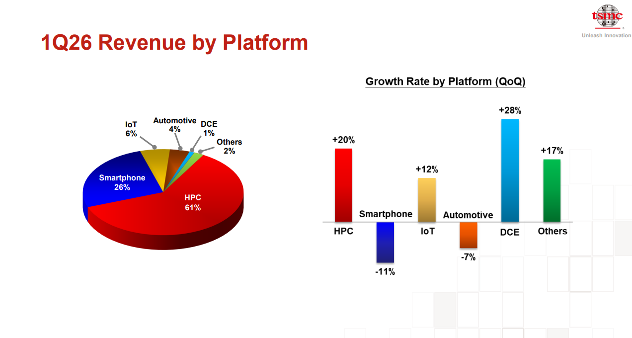按应用平台划分:高性能计算(HPC)环比增长 20%,占第一季度营收 61%;智能手机环比下降 11%,占 26%;物联网环比增长 12%,占 6%;汽车环比下降 7%,占 4%;数据中心边缘(DCE)环比增长 28%,占 1%。