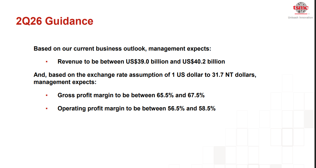 基于当前业务展望,预计第二季度营收介于 390 亿至 402 亿美元,中位数环比增长 10%、同比增长 32%。按 1 美元兑 31.7 新台币汇率测算,预计毛利率 65.5%-67.5%,营业利润率 56.5%-58.5%。此外,第二季度需计提未分配盈余所得税,因此税率约 20%;全年税率仍预计为 17%-18%。财务汇报到此结束,接下来进入核心信息环节,我先说明 2026 年一、二季度盈利情况。