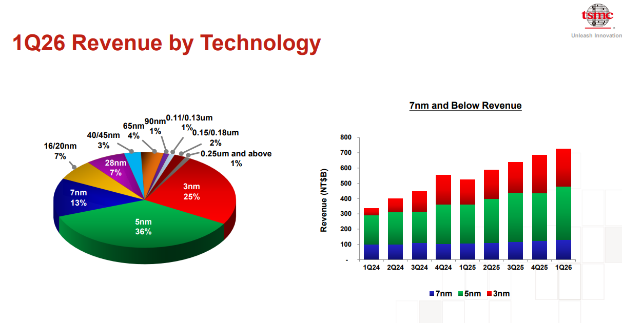 3 纳米工艺贡献第一季度晶圆营收的 25%,5 纳米与 7 纳米分别占 36% 和 13%。7 纳米及以下先进工艺合计占晶圆营收的 74%。