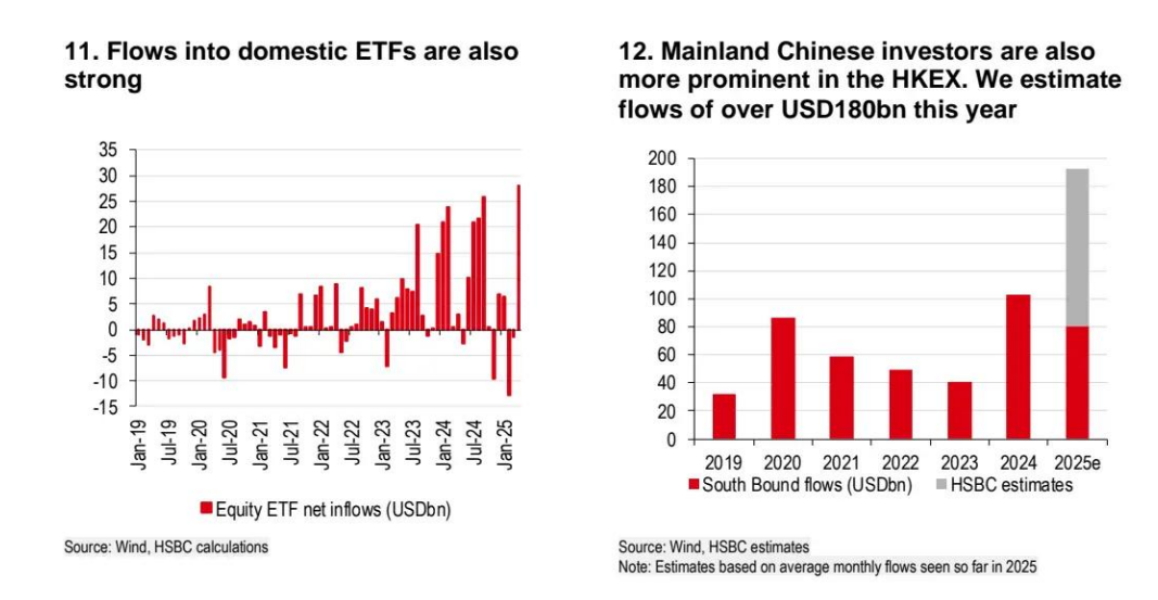 这也有助于解释今年年初以来通过港股通流入香港的创纪录资金 —— 相当于 800 亿美元。汇丰测算,按目前的速度,全年可能达到 1800 亿美元(下图右)。这相当于 2024 年流入美国股票的外资的一半!